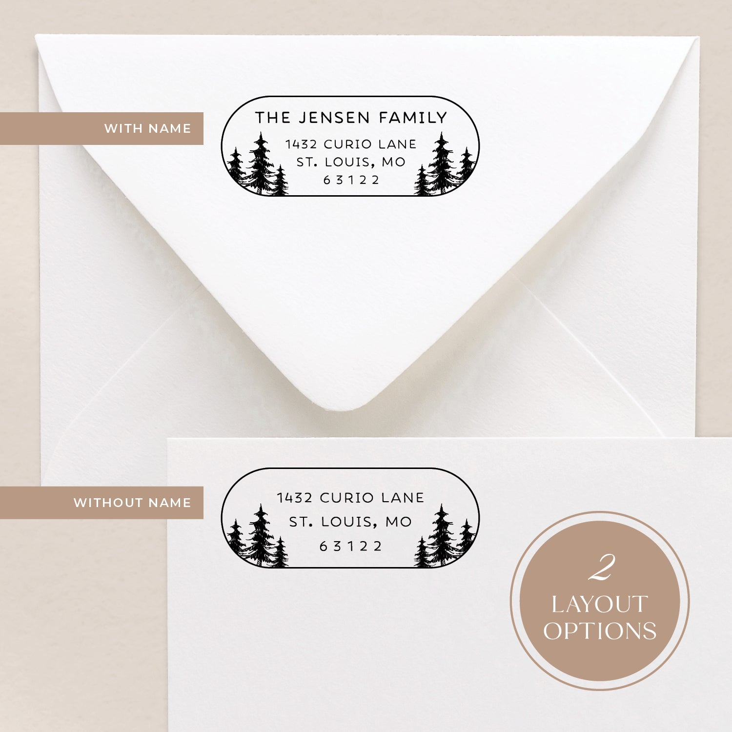 Oval address stamp design with hand-drawn trees on either side and modern rounded text centered inside the frame