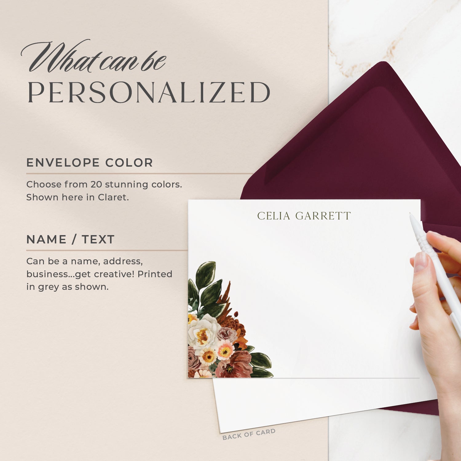 Warm and timeless, these personalized flat cards feature a softly illustrated autumn bouquet arranged in the corner for a refined seasonal touch. Designed for everyday correspondence, they’re ideal for thank you notes, personal stationery, or thoughtful messages sent with intention. Personalize with your name or custom text to create stationery that feels uniquely yours.