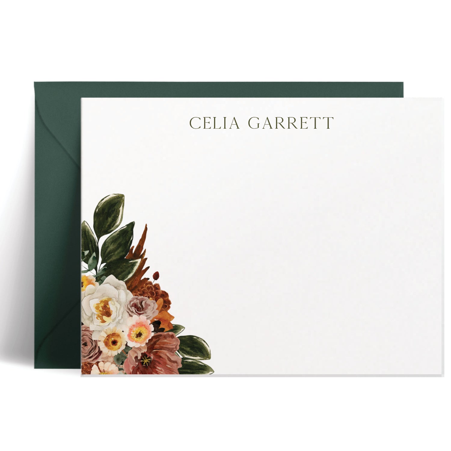 Fall floral personalized stationery card with warm seasonal bouquet design