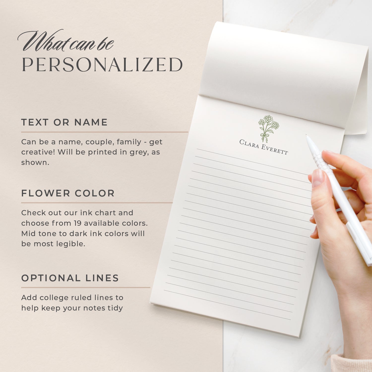 Personalized floral notepad with hydrangea sprig design