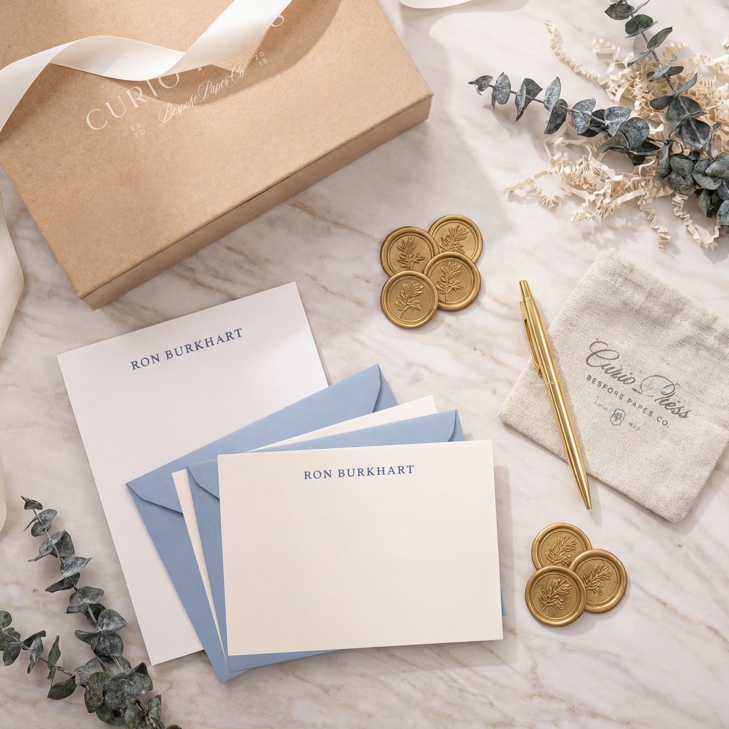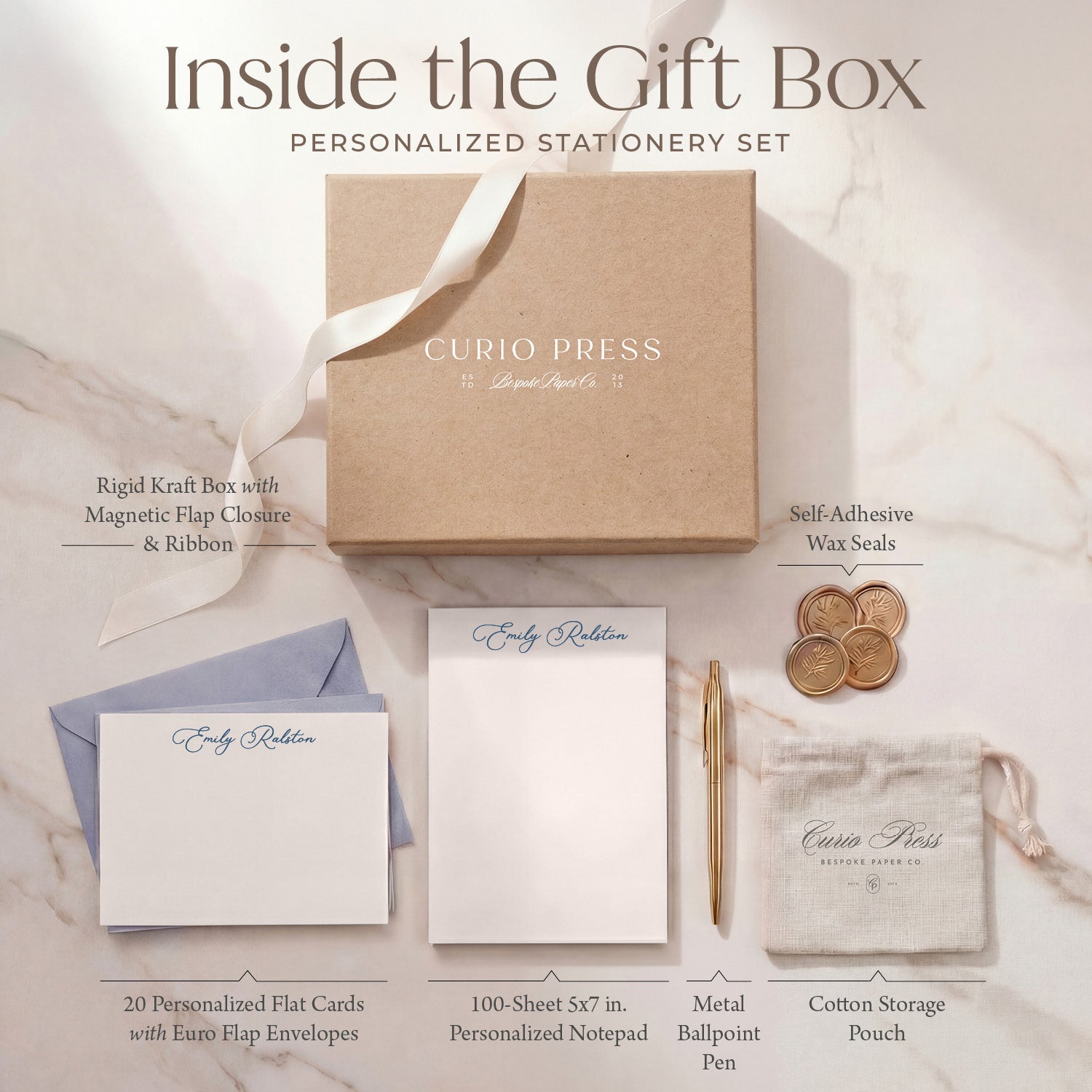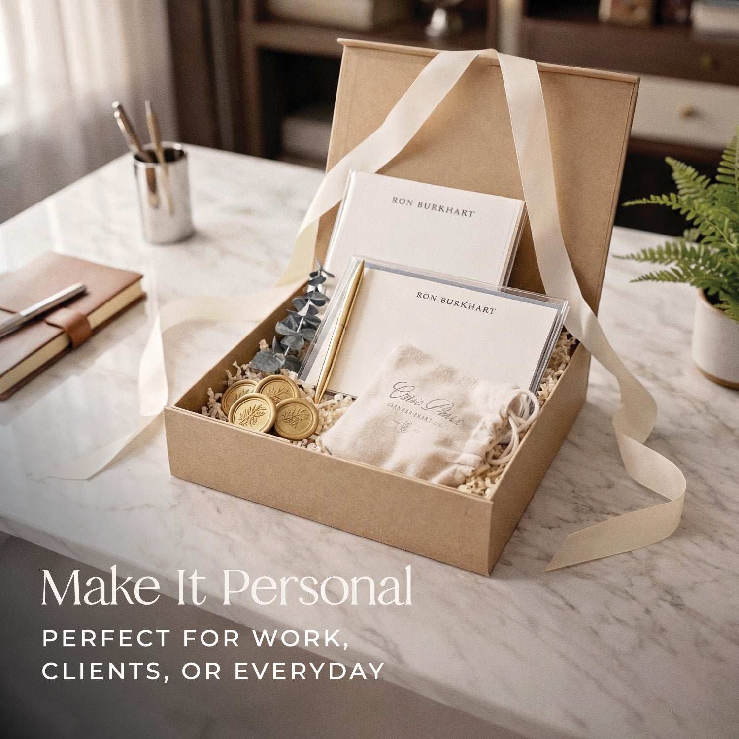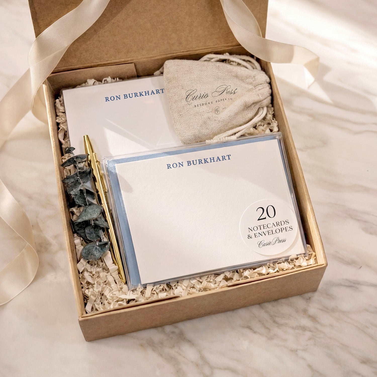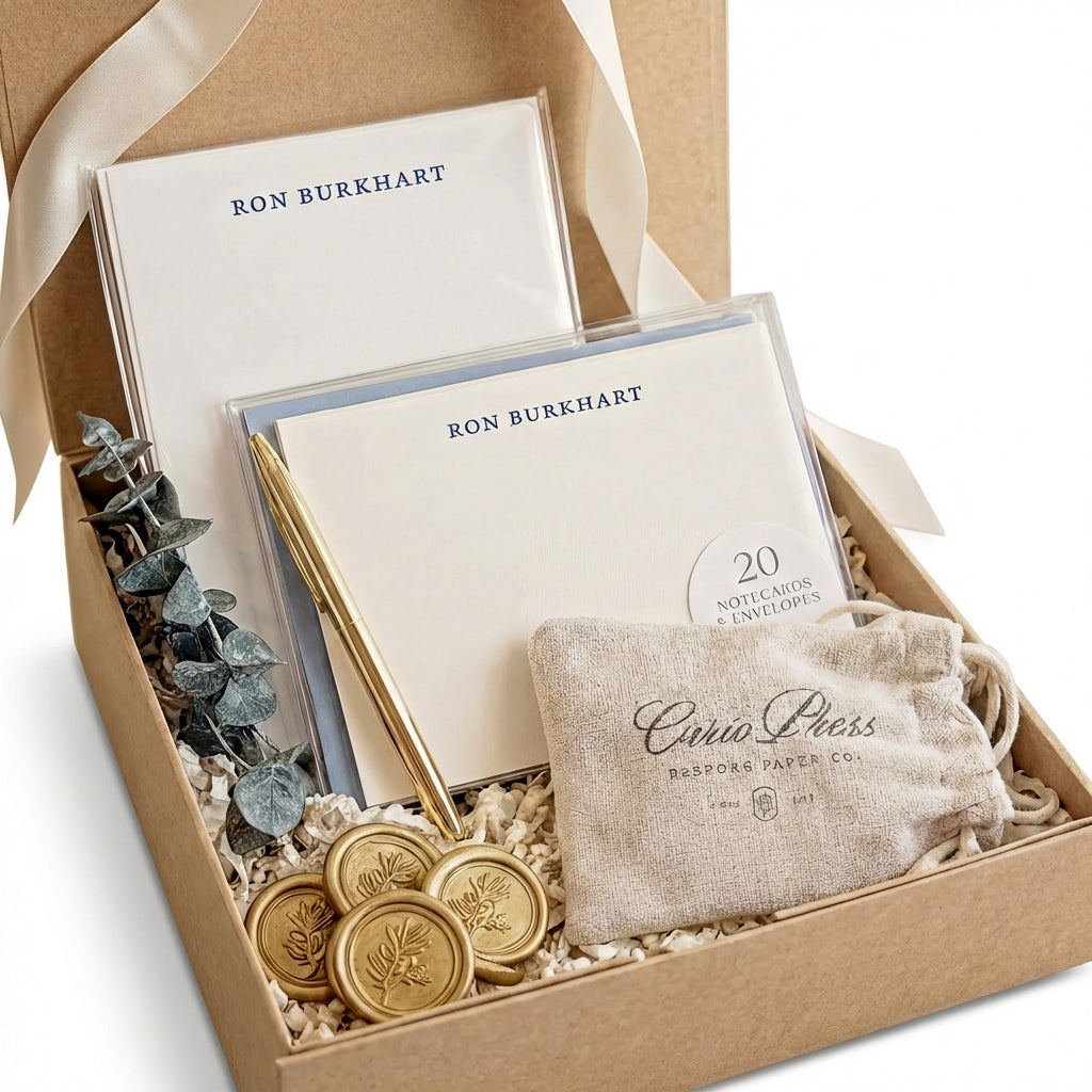 A complete, personalized writing set — beautifully packaged and ready to gift.