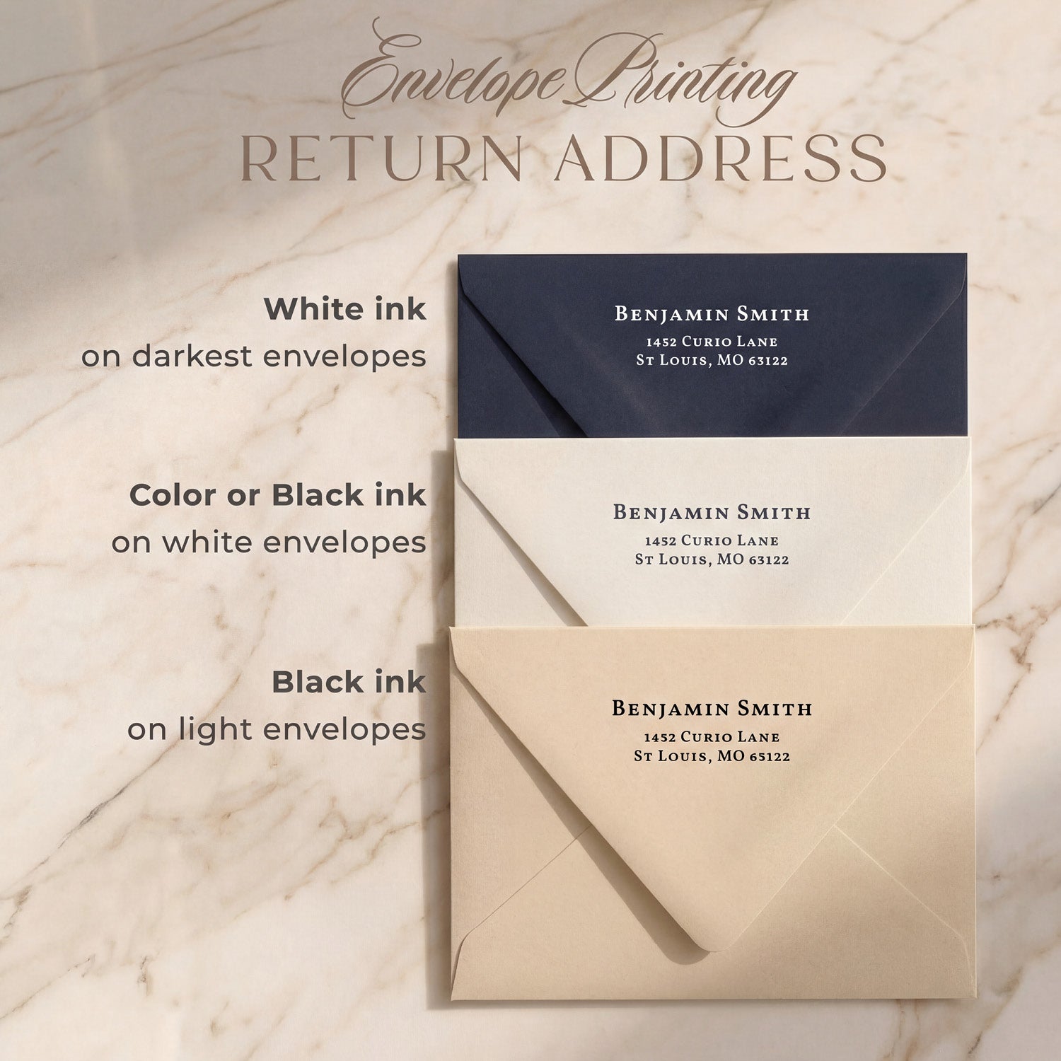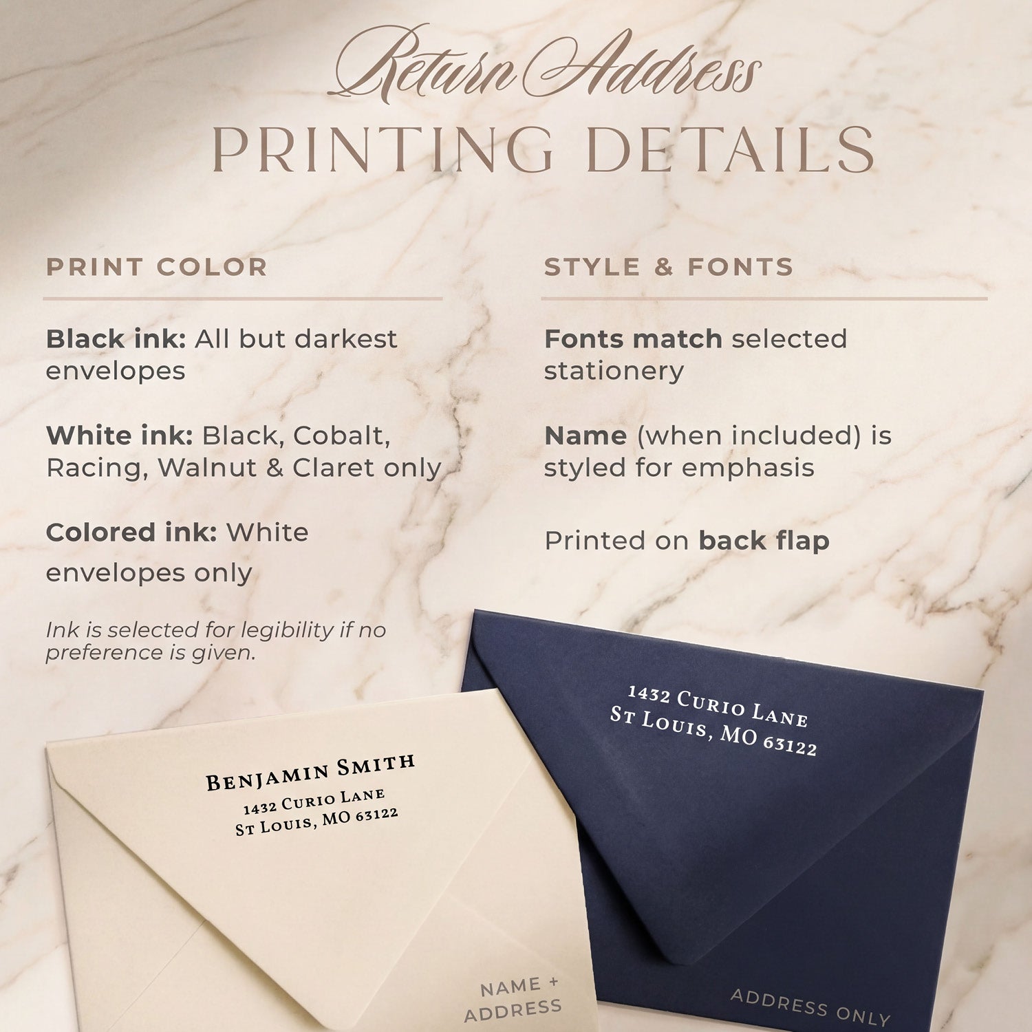 Available in 6 font styles with 29 ink color and 30 envelope color options. See option chart images.