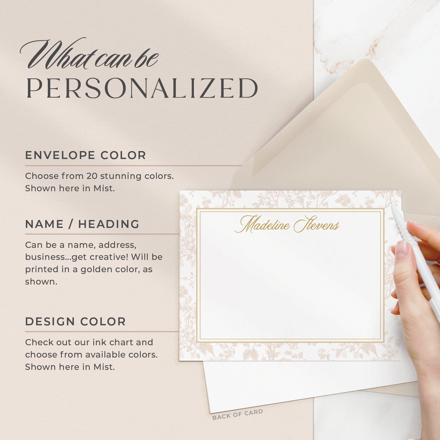 Make it uniquely yours! These personalized notecards are perfect for expressing gratitude, sending warm greetings, or simply keeping in touch with a refined touch. Your name, or a custom phrase of your choice, will be elegantly printed in a beautiful script font, making each card truly special. Choose the color for the toile border - inner border and name will be golden color shown.