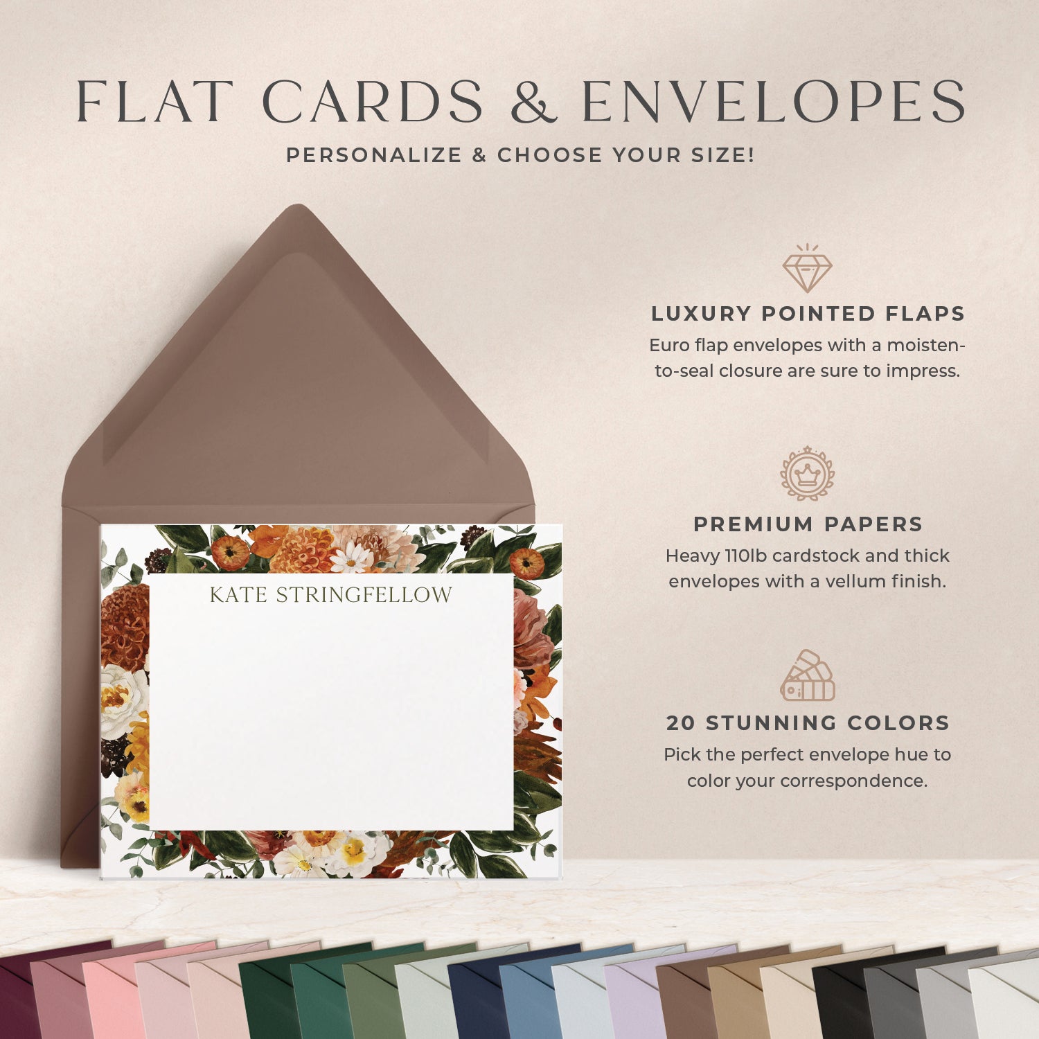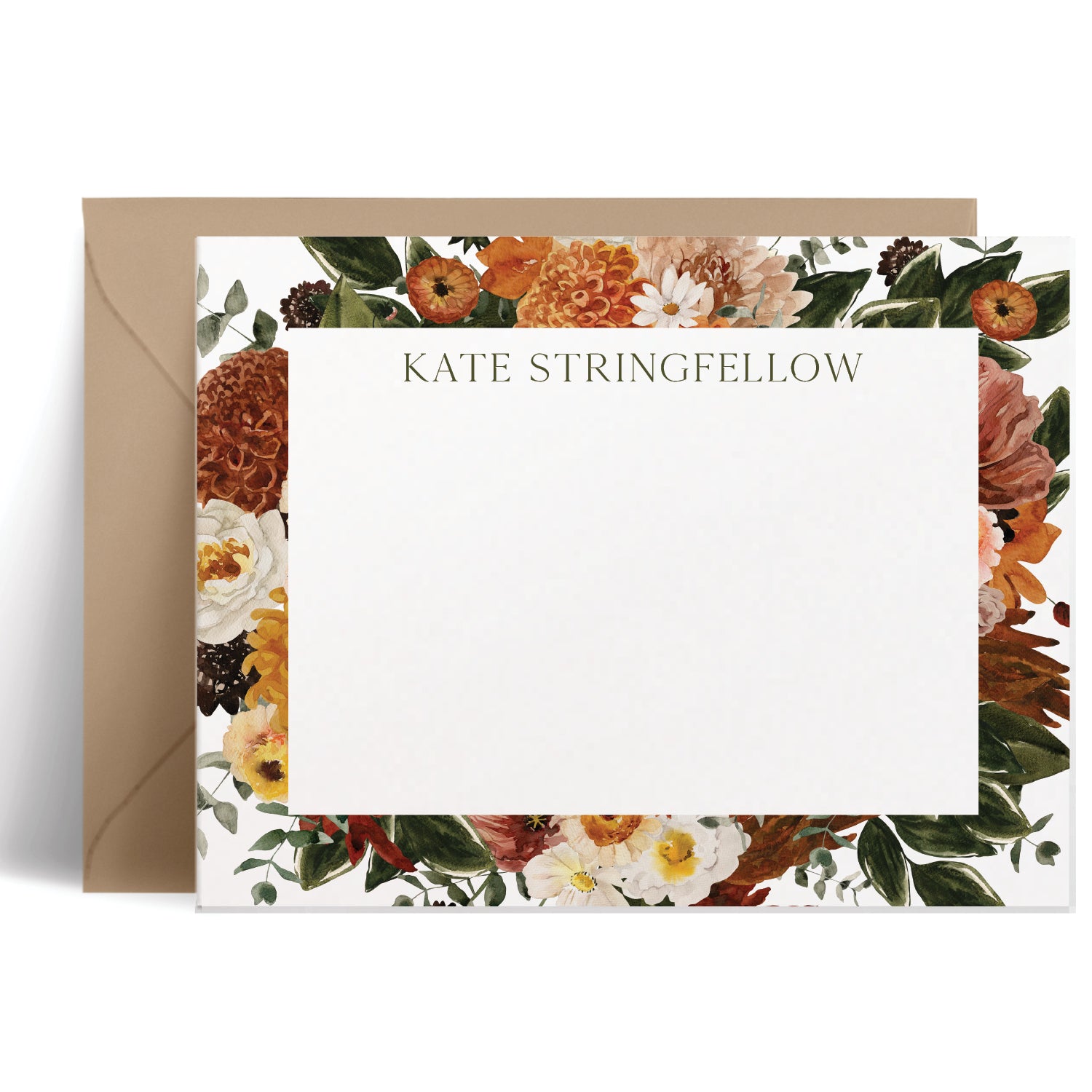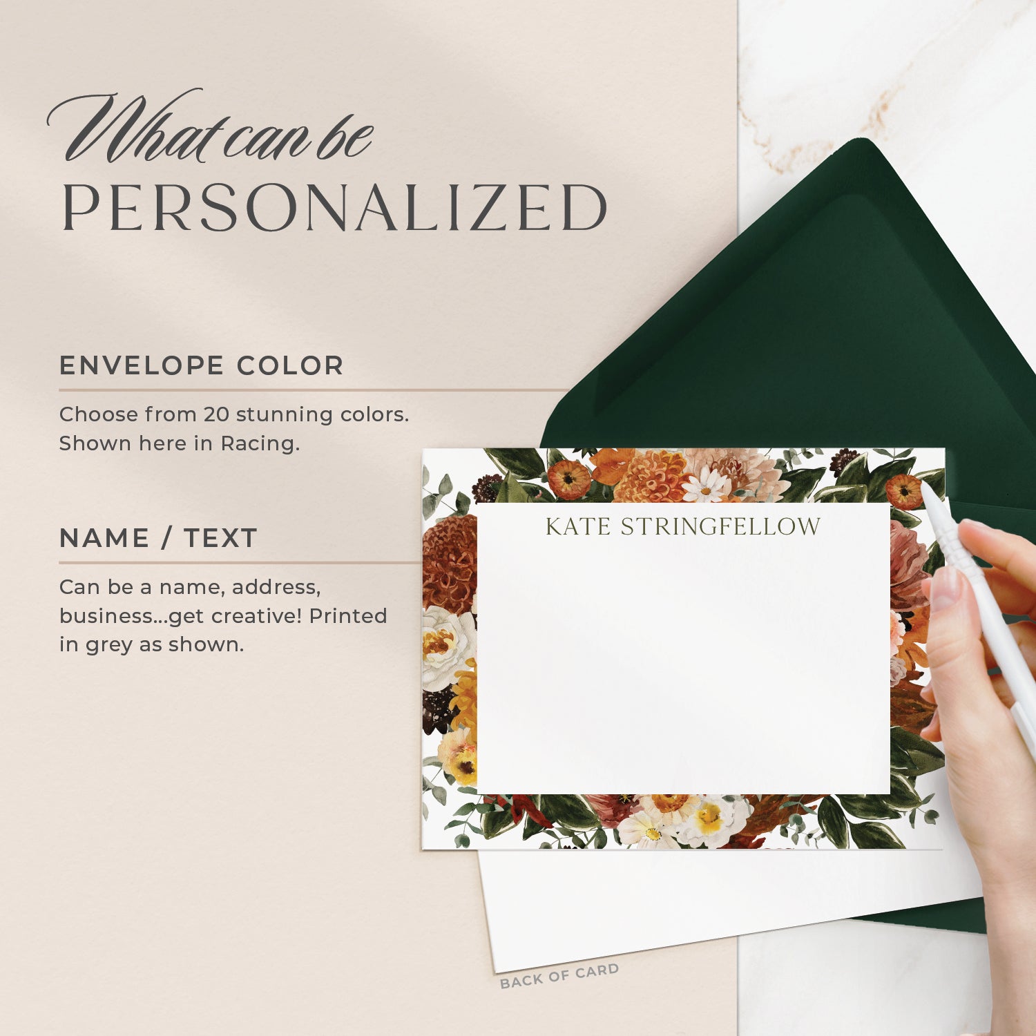 A personalized stationery design framed by a bold floral border of illustrated dahlias in rich, autumnal tones. Wild Dahlia flat note cards balance expressive florals with a clean writing space, making them well suited for thank you notes, everyday correspondence, and meaningful personal mail. A standout option for anyone drawn to floral stationery with presence.